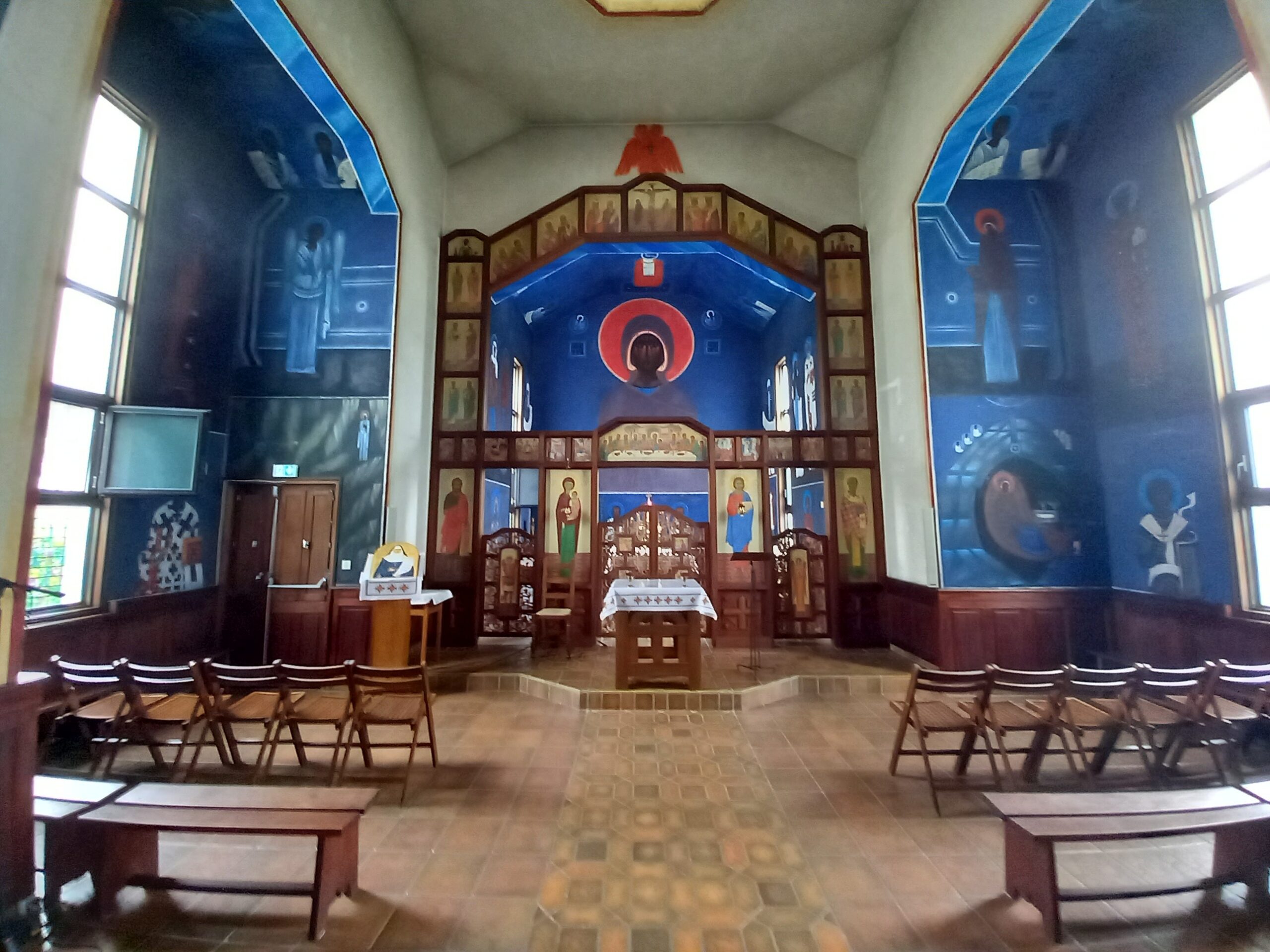 Ik wandel terug via een stukje van het parcours van de renners, nl. via de weg naar Pau. Zo kom ik aan de nadere zijde van het heiligdom, de kant met minder hotels en minder winkels. Ik zie een merkwaardige kerkje opduiken: Oosters, orthodox, of nog iets anders? Het blijkt de Oekraïense Grieks-Katholieke Kerk te zijn die er samenkomt. De kerk van het Ontslapen van de Moeder Gods werd ingewijd in 1982, zo lees ik in een foldertje dat ook in het Nederlands beschikbaar is, en is de enige oosters-katholieke gebedsplaats in Lourdes. Een mooi eenvoudige kerk, voorzien van polychromieën van Jerzy Nowosielski, een Poolse schilder van Oekraïense origine. Eens terug buiten vind ik een wegwijzer om via een trap naar het heiligdom ‘af te dalen’. Inderdaad een kortere weg terug naar de Gave. Ik breng de chocolade naar mijn kamer en los zuster Marie af om de laatste permanentie tijdens mijn verblijf in Lourdes aan te vatten. Zuster Marie vertelt me dat het een zeer rustige namiddag was, en ik merk dat ook in de avond: weinig passage op zondag. Toch komt er nog een vrijwilligster van de Hospitalité Notre-Dame de Lourdes binnen. Haar moedertaal blijkt Duits te zijn en ze lijkt wat in de war door OPM & Missio te zien. Inderdaad, op vrijdag werd een pakket van Missio -Oostenrijk geleverd met exemplaren hun tijdschrift, dat zuster Thérèse een plekje gaf in het ‘winkeltje’. Ik geef haar een exemplaar van het tijdschrift. ‘Die man heb ik hier vorige week ontmoet’, merkt ze op als de cover bekijkt en wijst naar pater Karl Wallner die in 2019 in Sri Lanka de bouwwerf van het eerste cisterciënzerklooster in Sri Lanka bezoekt. Het blijkt dus nogmaals dat in Lourdes de wereldkerk elkaar ontmoet.