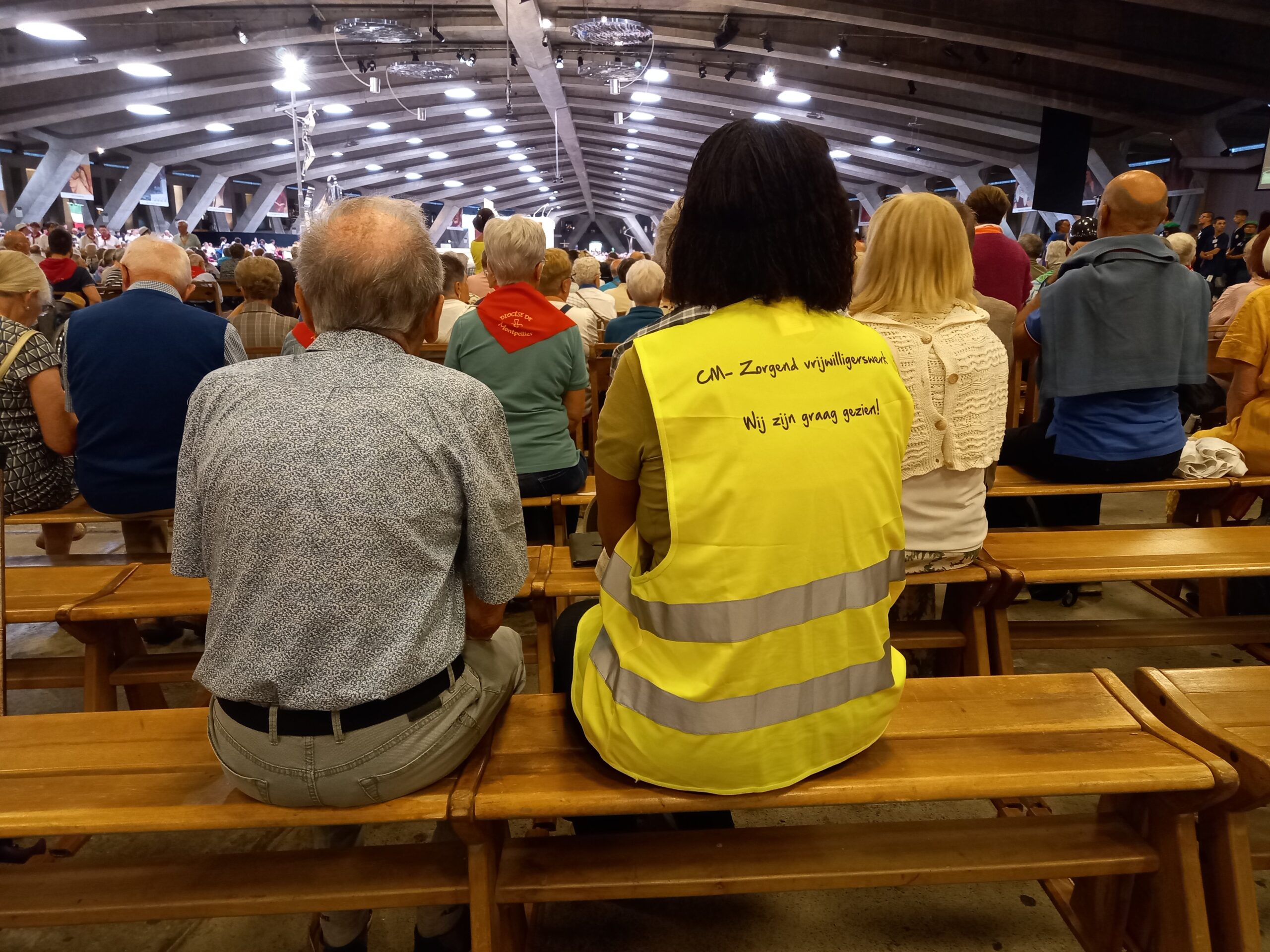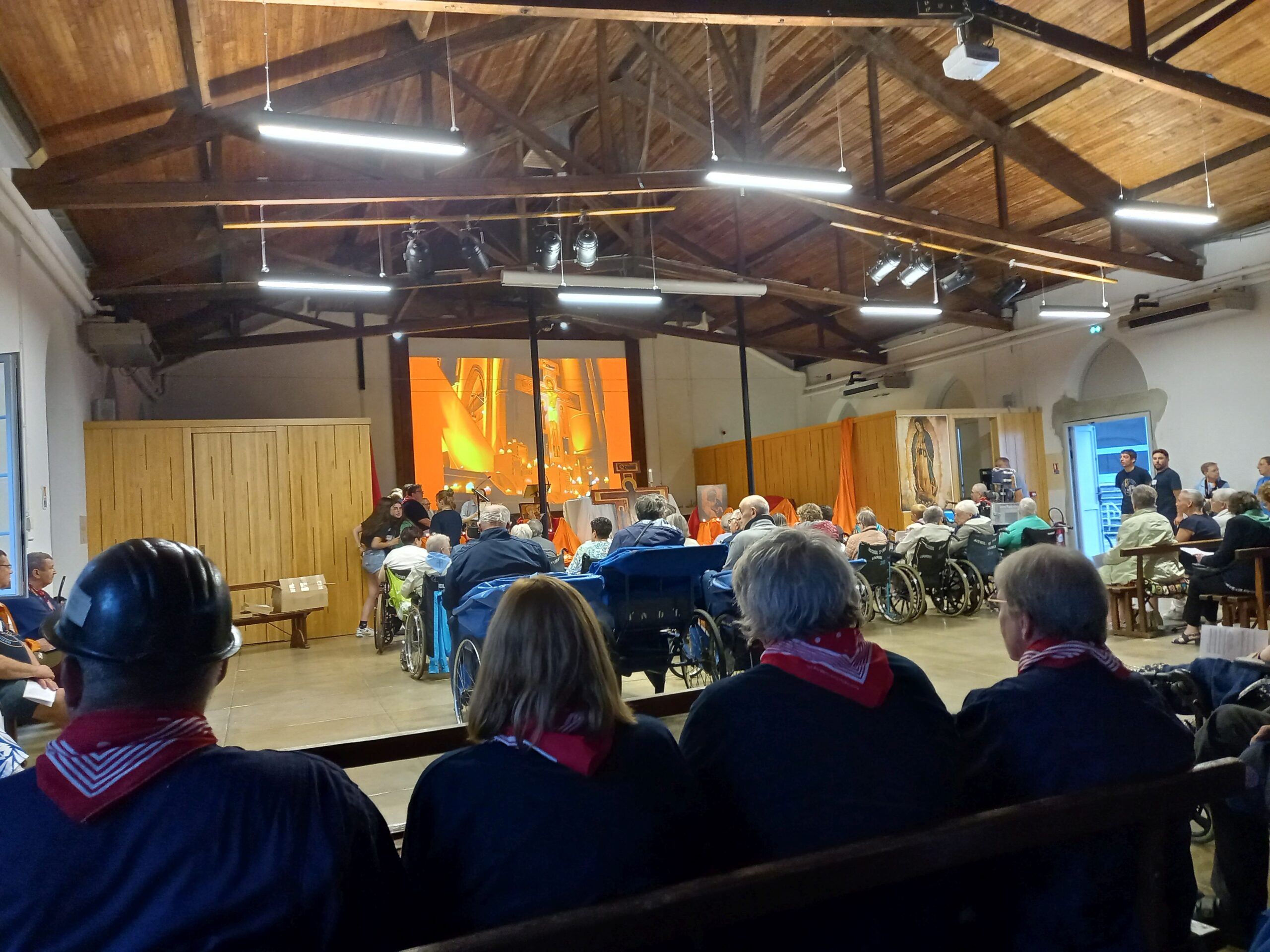 Ditmaal wordt aan het hoofdaltaar gevierd en rondom het altaar vullen de plekken voor rolstoelen en bedden zich stilaan en ook de zitplaatsen worden ingenomen. Ik neem een plekje achter een groep uit het bisdom Hasselt, duidelijk te onderscheiden door de uniformen van de mijnwerkers-brancardiers, maar ook met een duidelijke aanwezigheid van bedevaarders van Samana. Ondertussen oefent het koor reeds wat liederen in. Ongeveer 20 minuten voor de aanvang van de viering klinkt in verschillende talen, waaronder ook het Nederlands, een welkom door enkele ‘kapelanen’ die verschillende landen en talen permanent vertegenwoordigen in Lourdes. Ook priester Dominique Derkoningen verwelkomt in het bijzonder de bedevaarders van Samana Limburg, de diocesane bedevaarders van ‘zijn’ bisdom Hasselt en de scoutsgroep van Keerbergen, ook aanwezig in Lourdes. De vertaling van de homilie, gehouden door mgr. Norbert Turini, aartsbisschop van Montpellier en voorganger van de viering, zal in het Nederlands op de schermen verschijnt, laat de kapelaan nog weten. Ondertussen is de intredeprocessie met vlaggen van verschillende bedevaartgroepen, met ook enkele vlaggen van Samana, begonnen en worden ze gevolgd door een rist concelebranten, enkele diakens en de voorganger, terwijl het orgel klinkt in de basiliek.